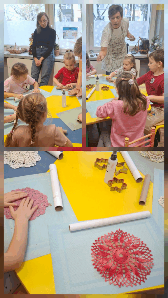 Dziś, w ramach warsztatów ceramicznych, pani Asia i pani Kinga z pracowni ceramicznej ZSO nr 5 odwiedziły grupę Krasnale. Podczas spotkania wspólnie z dziećmi tworzyły świąteczne ozdoby z gliny. Na początku maluchy poznały materiał, z którym miały pracować – glinę. Z zainteresowaniem dotykały jej, ugniatały, klepały i badały jej strukturę. W ramach prostych ćwiczeń manualnych lepiły gliniane kulki, co stało się doskonałym wprowadzeniem do dalszych działań twórczych. Następnie dzieci samodzielnie wałkowały glinę za pomocą wałków, a na uzyskanym płacie odbijały wzory z serwetek, tworząc ciekawe faktury. Później za pomocą foremek wykrawały pożądane kształty, które staną się ich wyjątkowymi, świątecznymi ozdobami.[...]