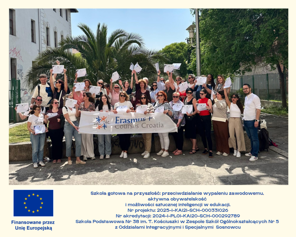 W dniach 13–17 kwietnia 2026r. p. Katarzyna Richtarz, p. Dorota Futyma oraz p. Marta Leśniak uczestniczyły w międzynarodowym szkoleniu w ramach programu Erasmus+, które odbyło się w chorwackim Splicie. Kurs pt. „Stress Management and Burnout Prevention” dotyczył zarządzania stresem oraz zapobiegania wypaleniu zawodowemu w pracy nauczyciela. W szkoleniu wzięli udział uczestnicy z różnych krajów Europy, co stworzyło doskonałą okazję do wymiany doświadczeń oraz dobrych praktyk edukacyjnych. Program kursu obejmował m.in.: Uczestnicy mieli również okazję wziąć udział w zajęciach terenowych oraz aktywnościach sprzyjających budowaniu dobrostanu psychicznego. Zdobyta wiedza i umiejętności zostaną wykorzystane w codziennej pracy dydaktycznej oraz przekazane innym nauczycielom naszej