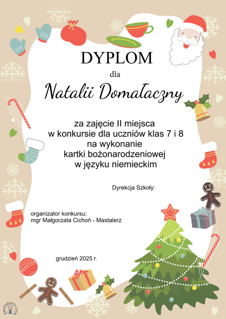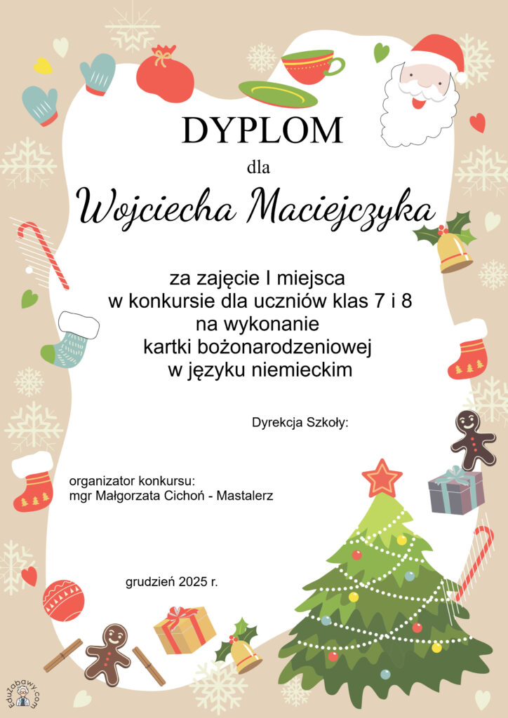 Podaję wyniki konkursu dla uczniów klas 7 i 8 na wykonanie kartki bożonarodzeniowej z życzeniami w języku niemieckim.