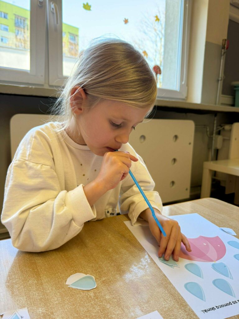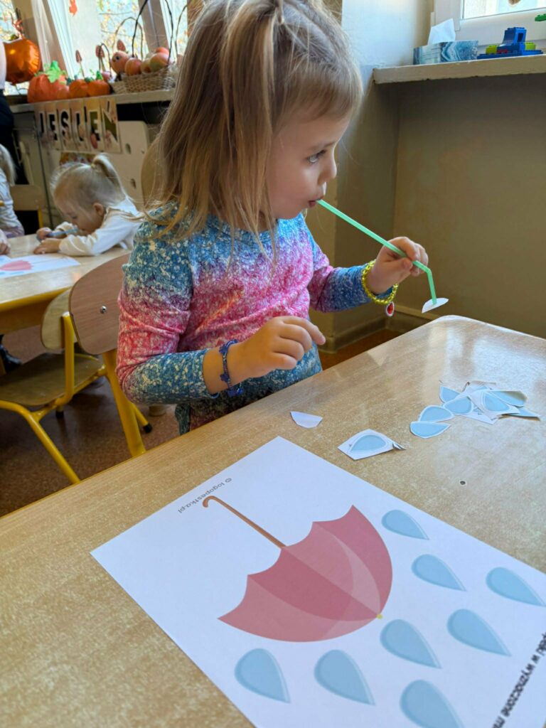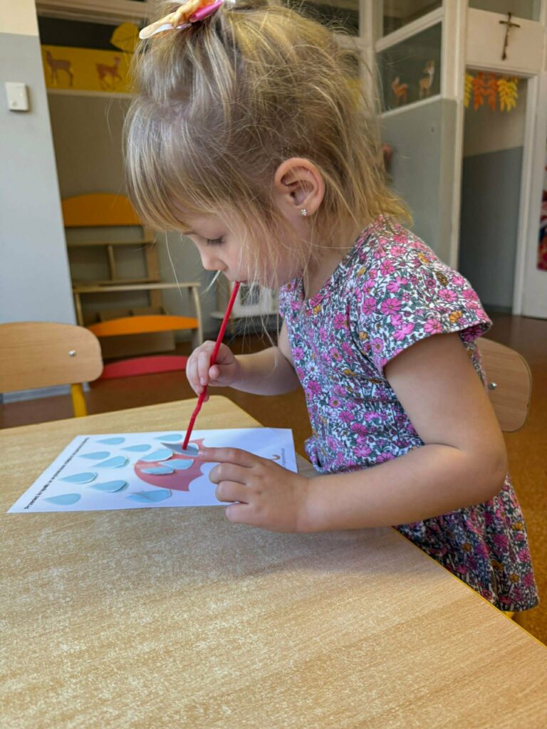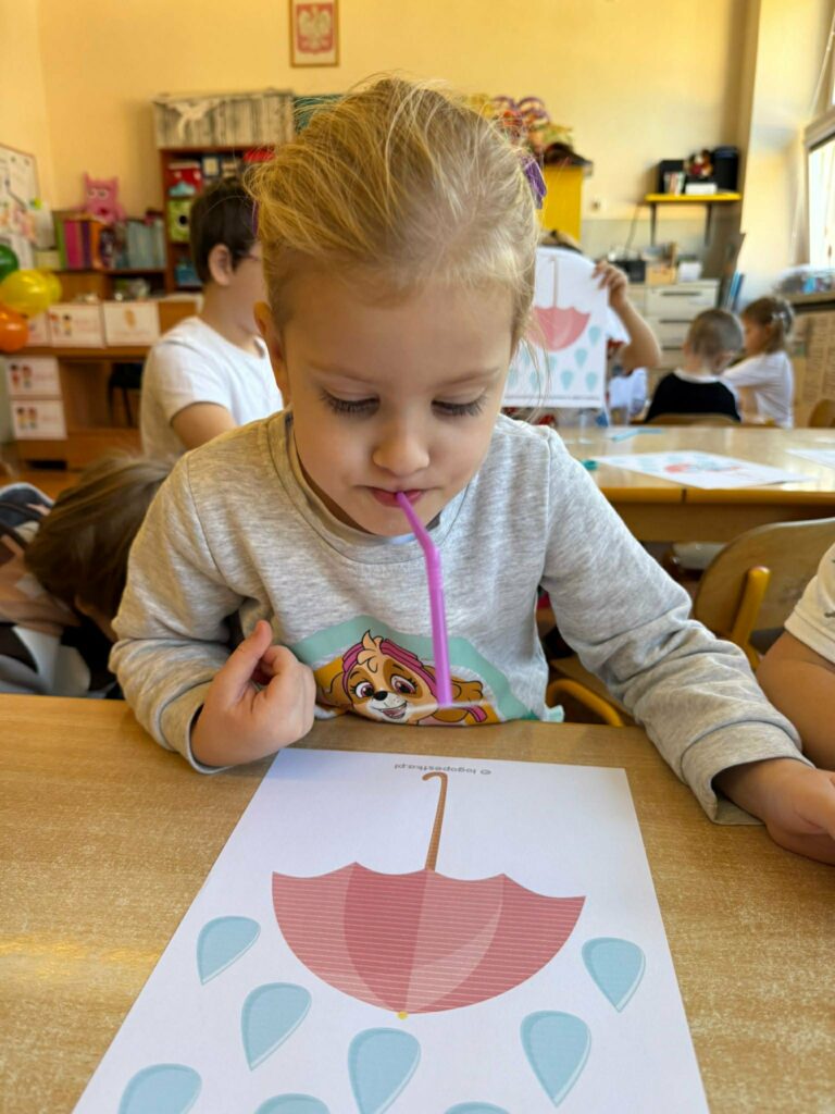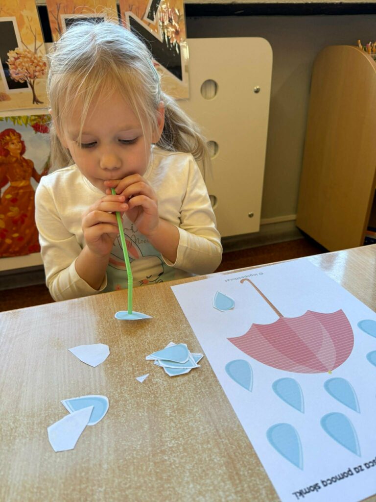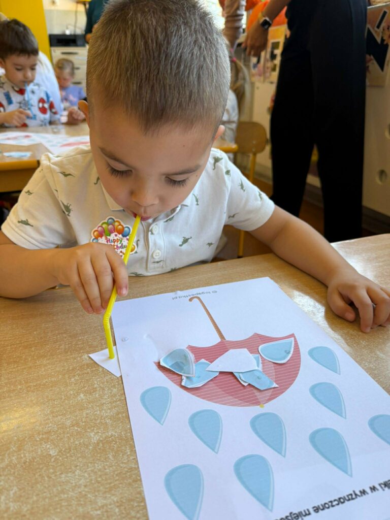 W pewien deszczowy poranek w grupie Sarenki zrobiło się naprawdę mokro — oczywiście tylko w wyobraźni! Wraz z panią logopedką realizowaliśmy kolejną literę alfabetu w ramach projektu „Alfabet logopedyczny”. Wycinaliśmy kolorowe kropelki deszczu, przenosiliśmy je na parasole, ćwicząc przy tym nasze języki, buzie i paluszki. Było dużo śmiechu i zabawy.