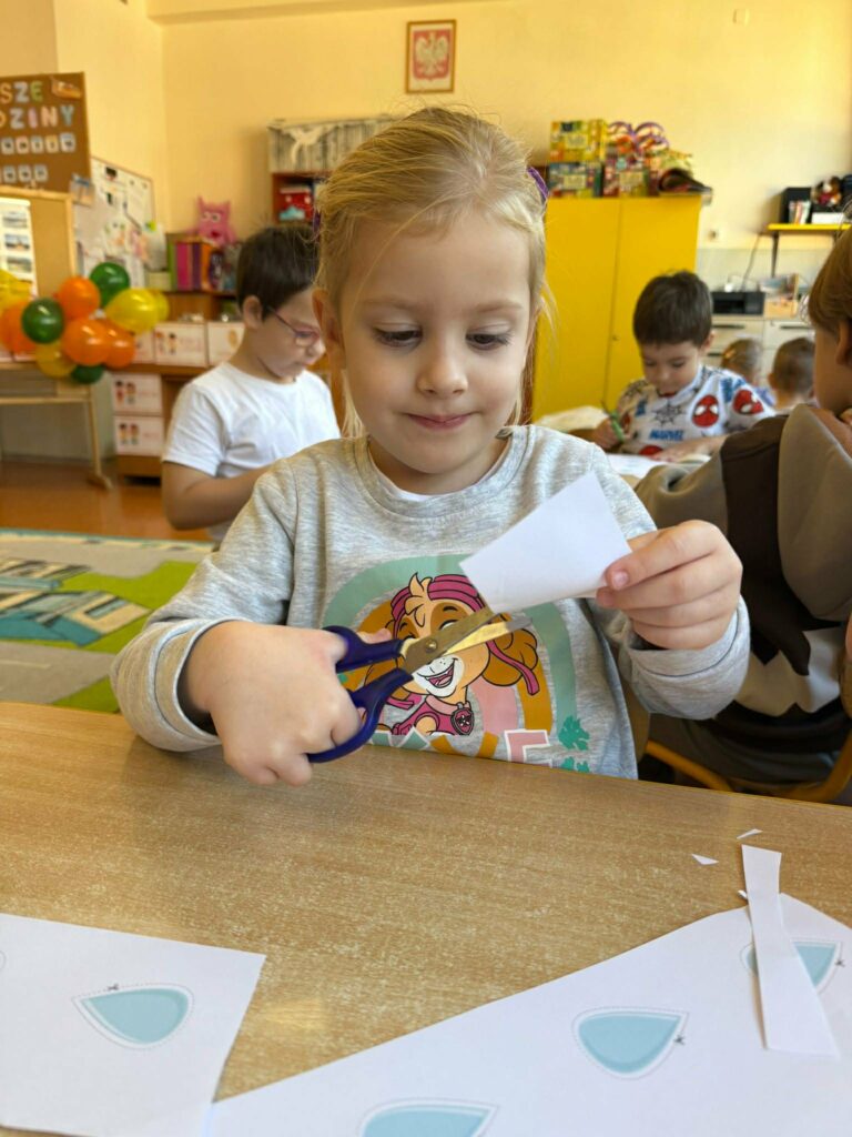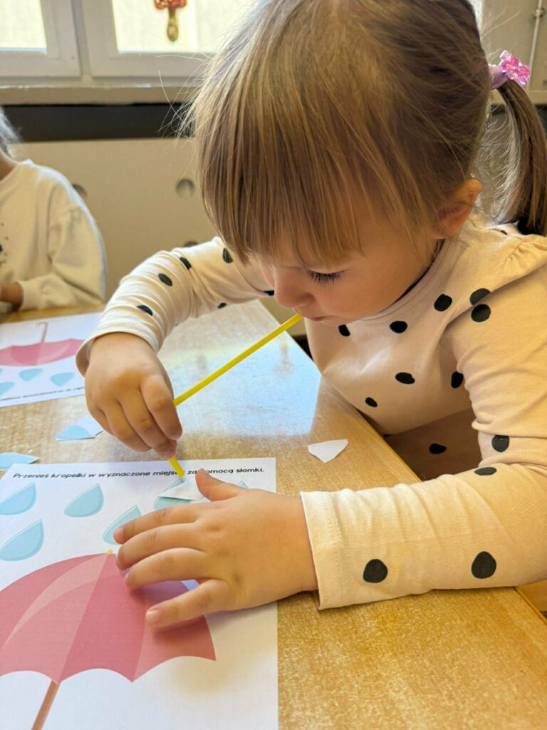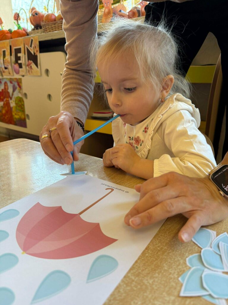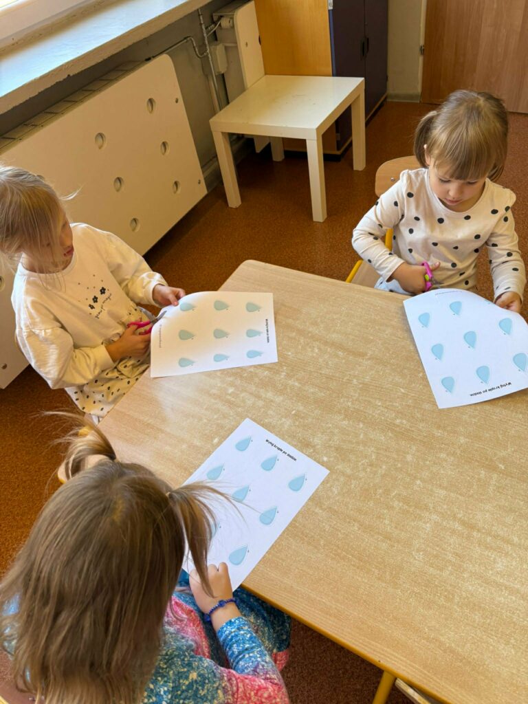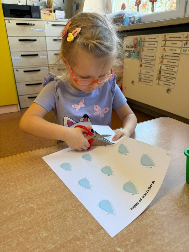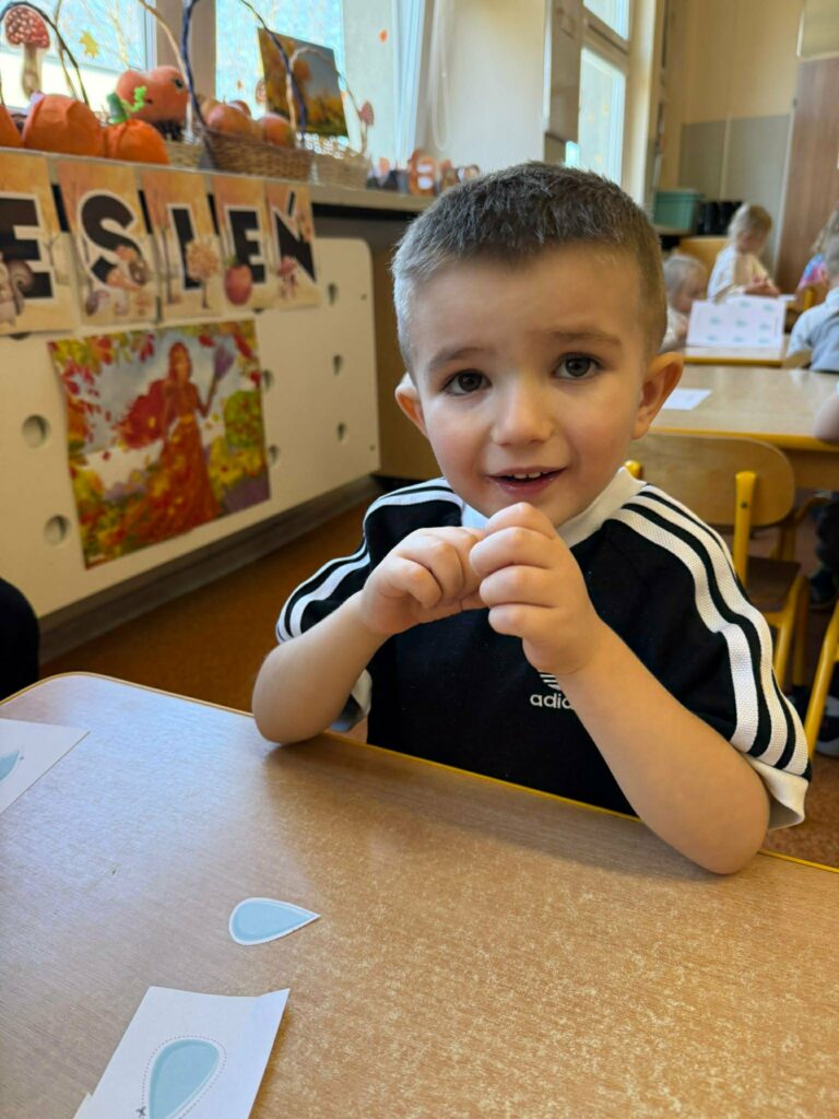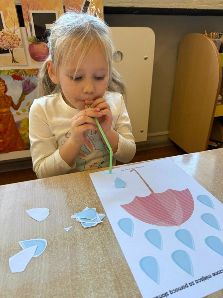 W pewien deszczowy poranek w grupie Sarenki zrobiło się naprawdę mokro — oczywiście tylko w wyobraźni! Wraz z panią logopedką realizowaliśmy kolejną literę alfabetu w ramach projektu „Alfabet logopedyczny”. Wycinaliśmy kolorowe kropelki deszczu, przenosiliśmy je na parasole, ćwicząc przy tym nasze języki, buzie i paluszki. Było dużo śmiechu i zabawy.