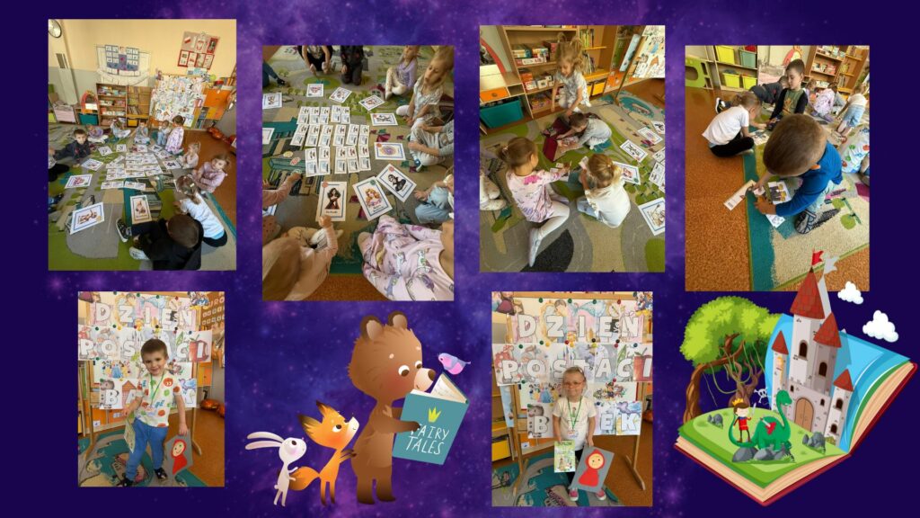 Podczas zajęć dzieci rozpoznawały bajkowe postacie i tytuły bajek na podstawie ilustracji, zagadek i fragmentów znanych opowieści. Rozmawialiśmy o tym, czego uczą nas bajki i dlaczego warto je oglądać i czytać. Nie zabrakło wspólnych zabaw ruchowych, tanecznych i konkursów, takich jak „Zgadnij, kto to?”, „Bajkowe memory” czy „Taniec Kopciuszka”.