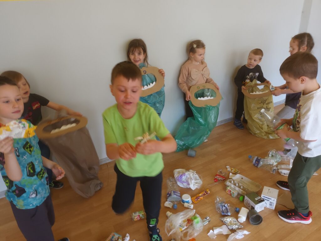 Dzieci poznały znaczenie słowa recykling a oglądając film edukacyjny dowiedziały się na czym polega ten proces. W ramach praktycznych zajęć posegregowały śmieci zgodnie z ustalonymi zasadami. Aktywny udział w grze planszowej był okazją do utrwalenia zdobytej wiedzy.