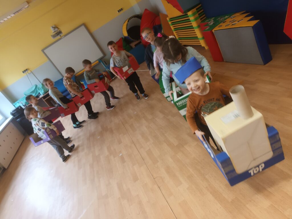 Wagony zrobione z kartonowych pudełek gwarantowały ciekawa zabawę.