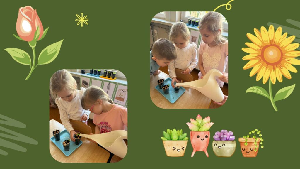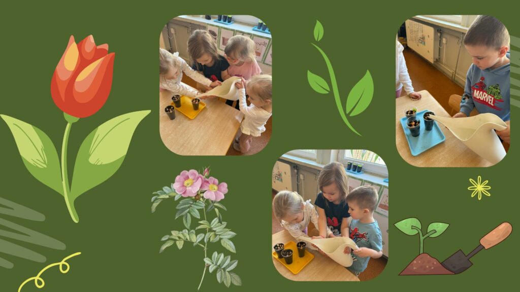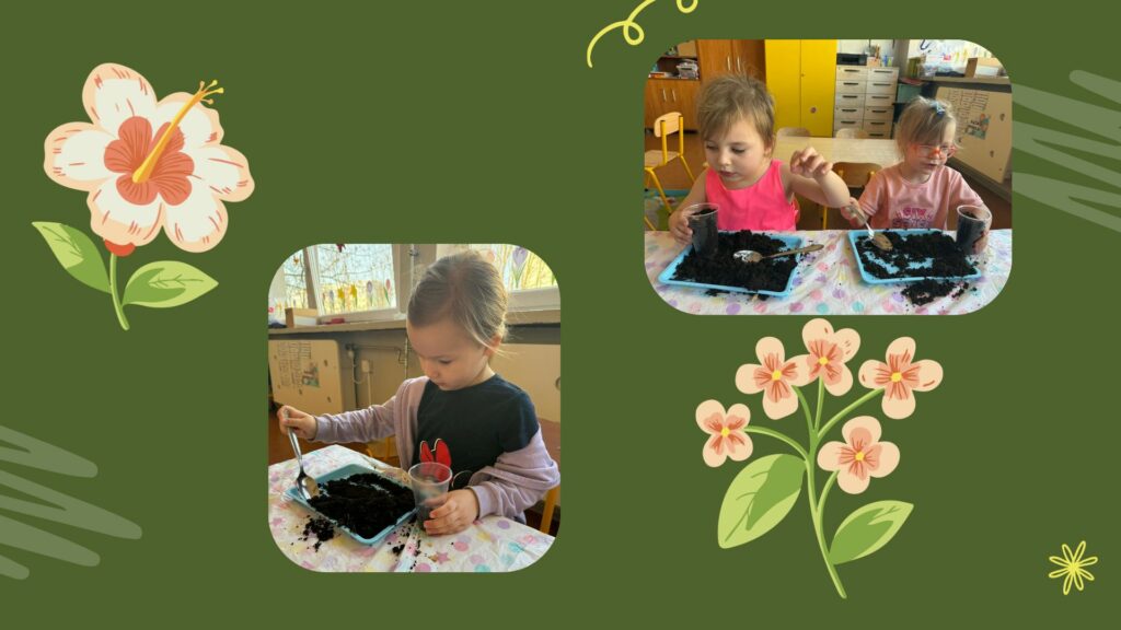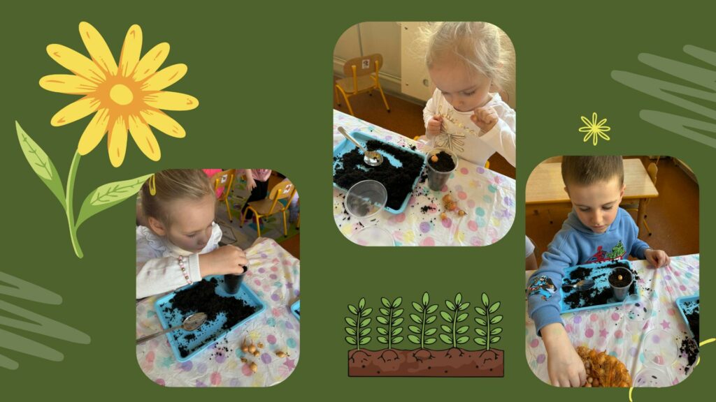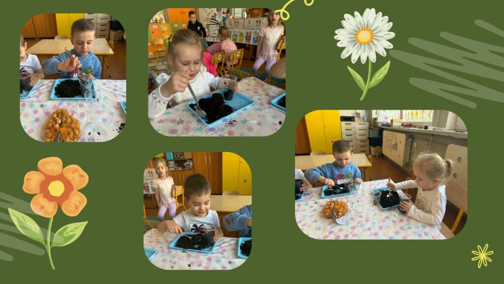 Najpierw dzieci dowiedziały się, czego potrzebują rośliny, aby mogły rosnąć: dobrej ziemi, wody, światła oraz troski. Następnie każde dziecko miało okazję samodzielnie posadzić cebulkę dymkę. Praca sprawiła wszystkim dużo radości, a dzieci z ogromnym zaangażowaniem wykonywały swoje zadania.