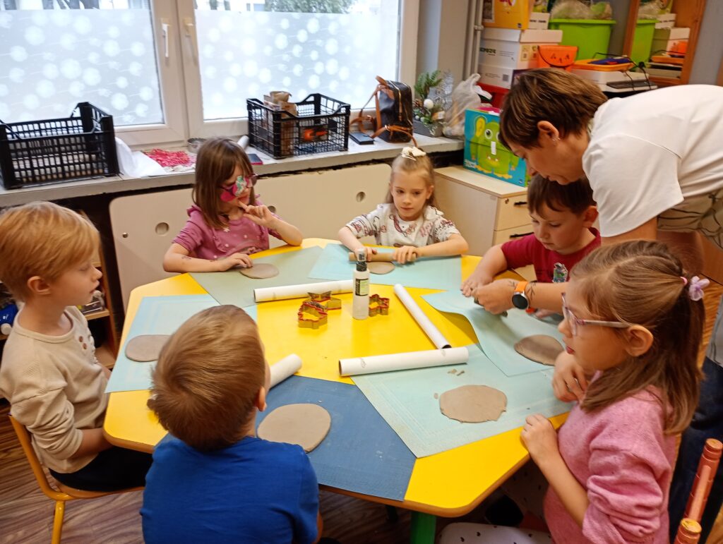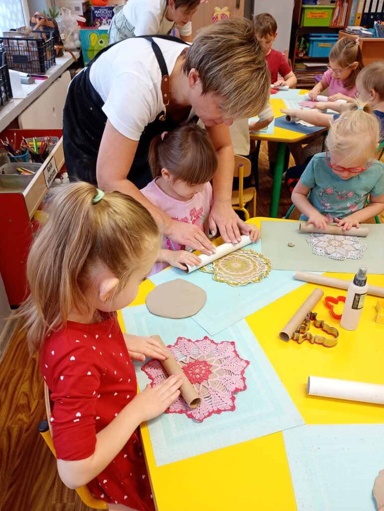 Z zainteresowaniem dotykały, ugniatały, badały jej strukturę. W ramach prostych ćwiczeń lepiły gliniane kulki, co stało się wprowadzeniem do dalszych działań twórczych. Następnie przedszkolaki same wałkowały glinę za pomocą wałków a na uzyskanym płacie odbijały wzory z serwetek. Później za pomocą foremek wykrywały pożądane kształty, które stały się ich wyjątkowymi ozdobami świątecznymi.