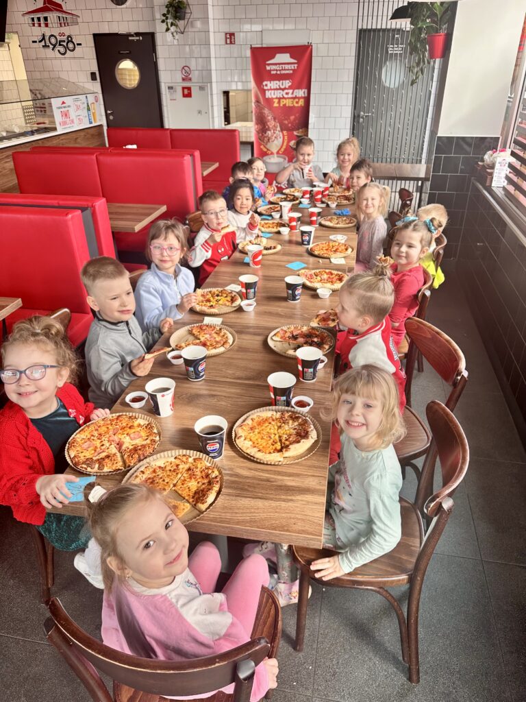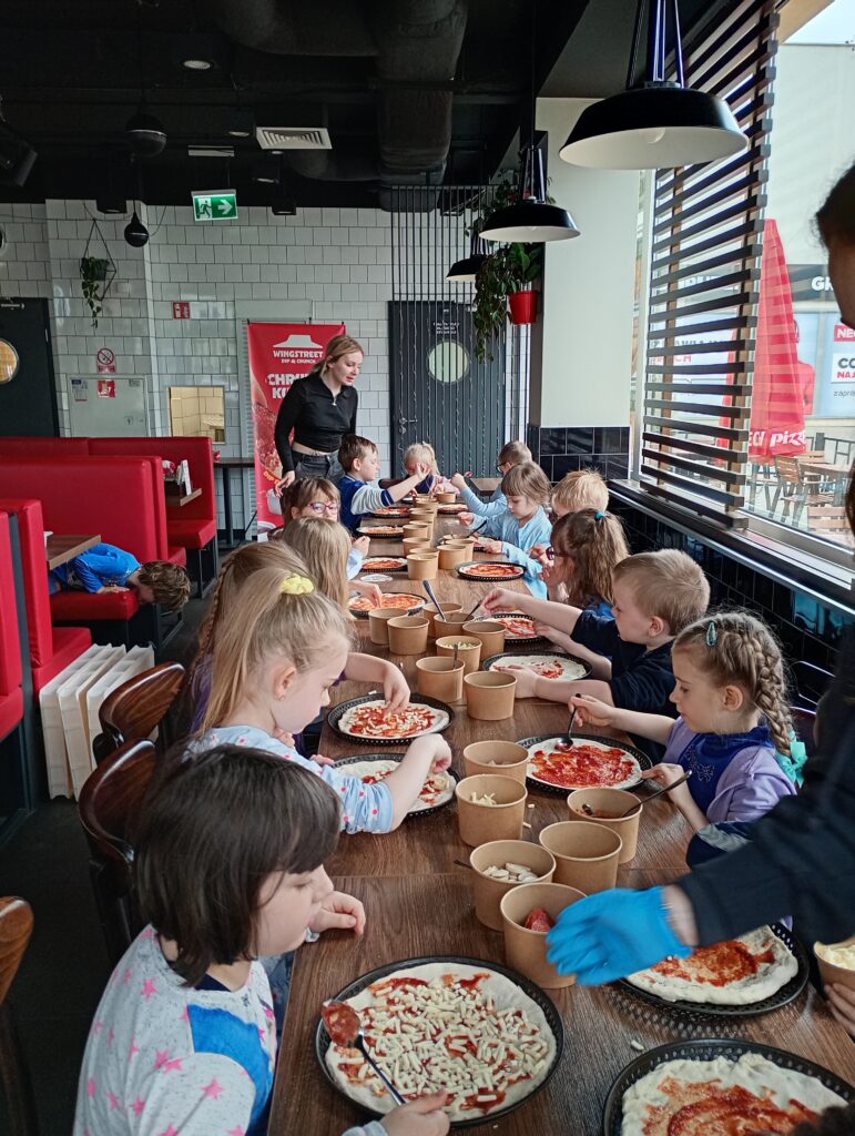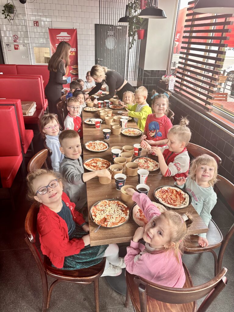 Dzieci z grupy Krasnale i Kaczory w ramach realizacji projektu „Europa i ja” wybrały się do pizzerii Pizza Hut w Sosnowcu i wzięły udział w niezwykle smakowitych warsztatach. Podczas zajęć dzieci poznały proces powstania pizzy – od przygotowania ciasta, poprzez wybór składników, aż po wypiek w prawdziwym piecu. Każdy mógł samodzielnie skomponować swoją pizzę, wybierając ulubione dodatki.