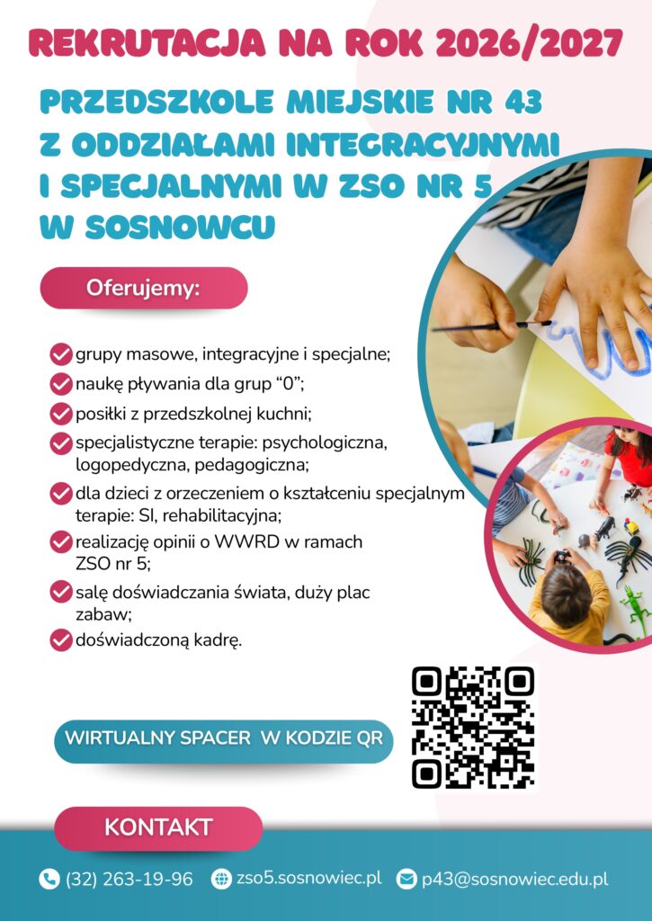 Dyrekcja Przedszkola Miejskiego nr 43 w Zespole Szkół Ogólnokształcących nr 5 z Oddziałami Integracyjnymi i Specjalnymi w Sosnowcu ul. Bohaterów Monte Cassino 46 uprzejmie informuje, iż zapisy do przedszkola na rok szkolny 2026/2027 rozpoczynają się od 02.03.2026 od godziny 12.00, a kończą się 13.03.2026 o godz. 16.00